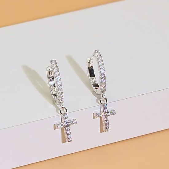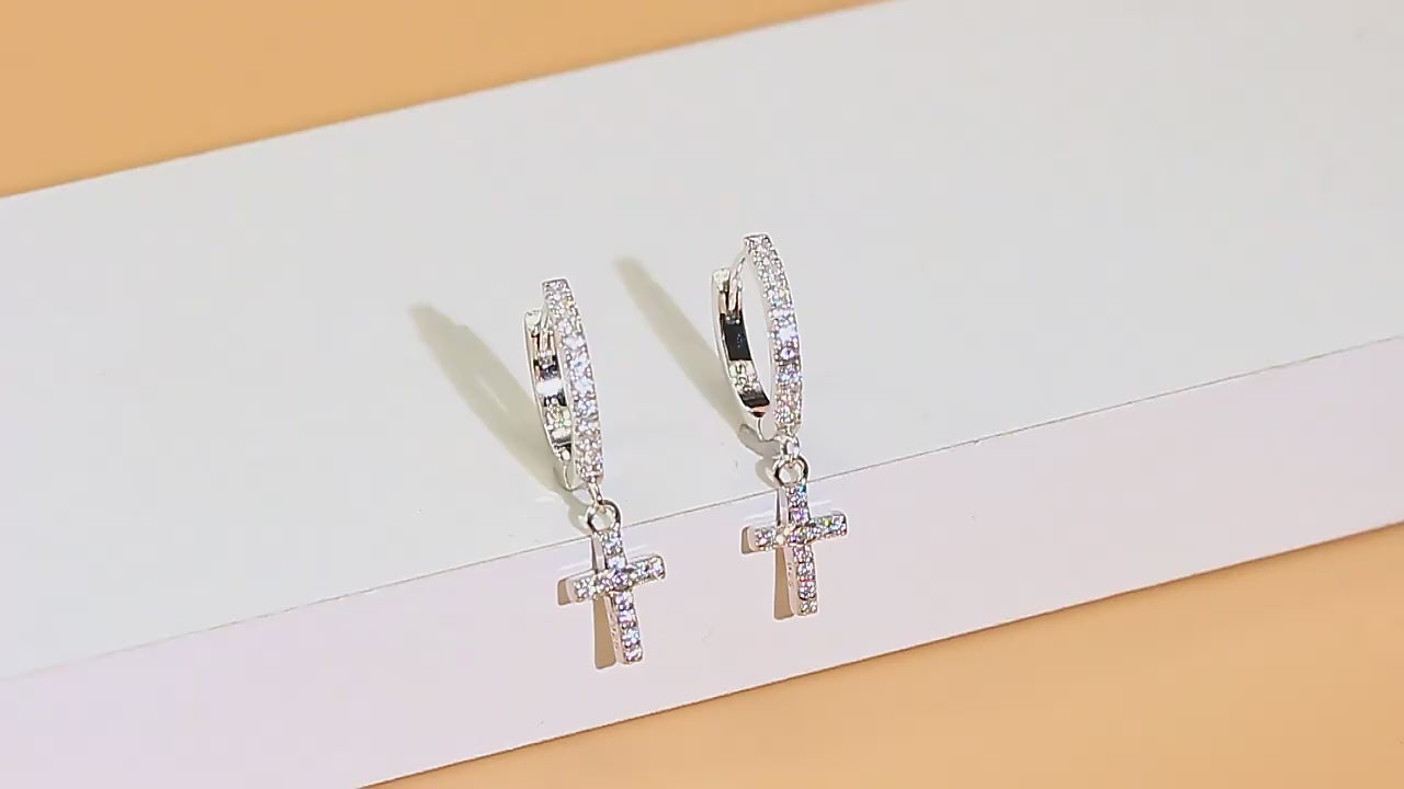 Meet the Celestia Cross Huggies — petite yet powerful, these 925 Sterling Silver Huggie Hoop Drop Earrings feature a shimmering cross design made with top-grade CZ stones. With their hypoallergenic structure and rhodium plating, they're made to be worn comfortably all day without tarnishing.