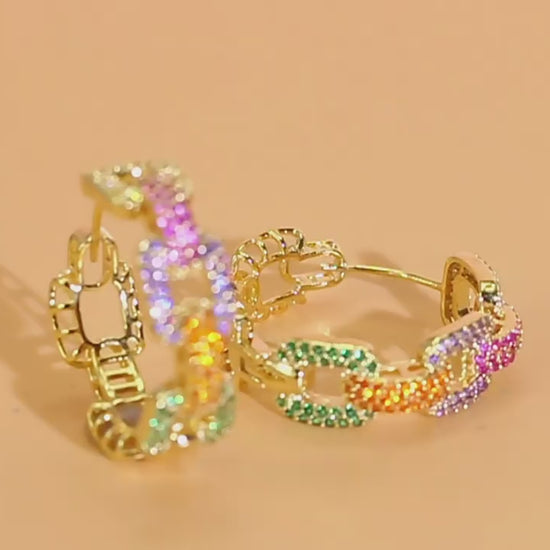 Bring a burst of vibrant color and luxury to your style with the Exquisite Color Hoop Earrings. Featuring colorful cubic zirconia stones set in an elegant 18K gold-plated design, these hoop earrings are perfect for parties and festive occasions. The exquisite chain design adds a touch of sophistication, making these earrings the perfect statement piece.