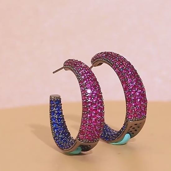 Design: Half-round hoops encrusted with red and blue zircon for a stunning contrast